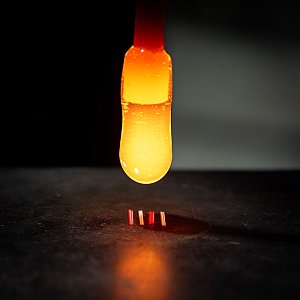 Jak to vypadá v praxi? Před samotnou výrobou kuliček do brněnského orloje musí skláři nachystat barevné nitě. Kousek sklářské barvy (tzv. rubínu; představte si to jako skleněnou tyč) se nalepí na píšťalu a dá se nahřát do pece. Tam změkne do konzistence plastelíny, takže je možné vytahat z ní pinzetou slabé nitě, které se po vychladnutí štípou kleštěmi do 2cm dlouhých čárek. Ty se položí na nerezový stůl.