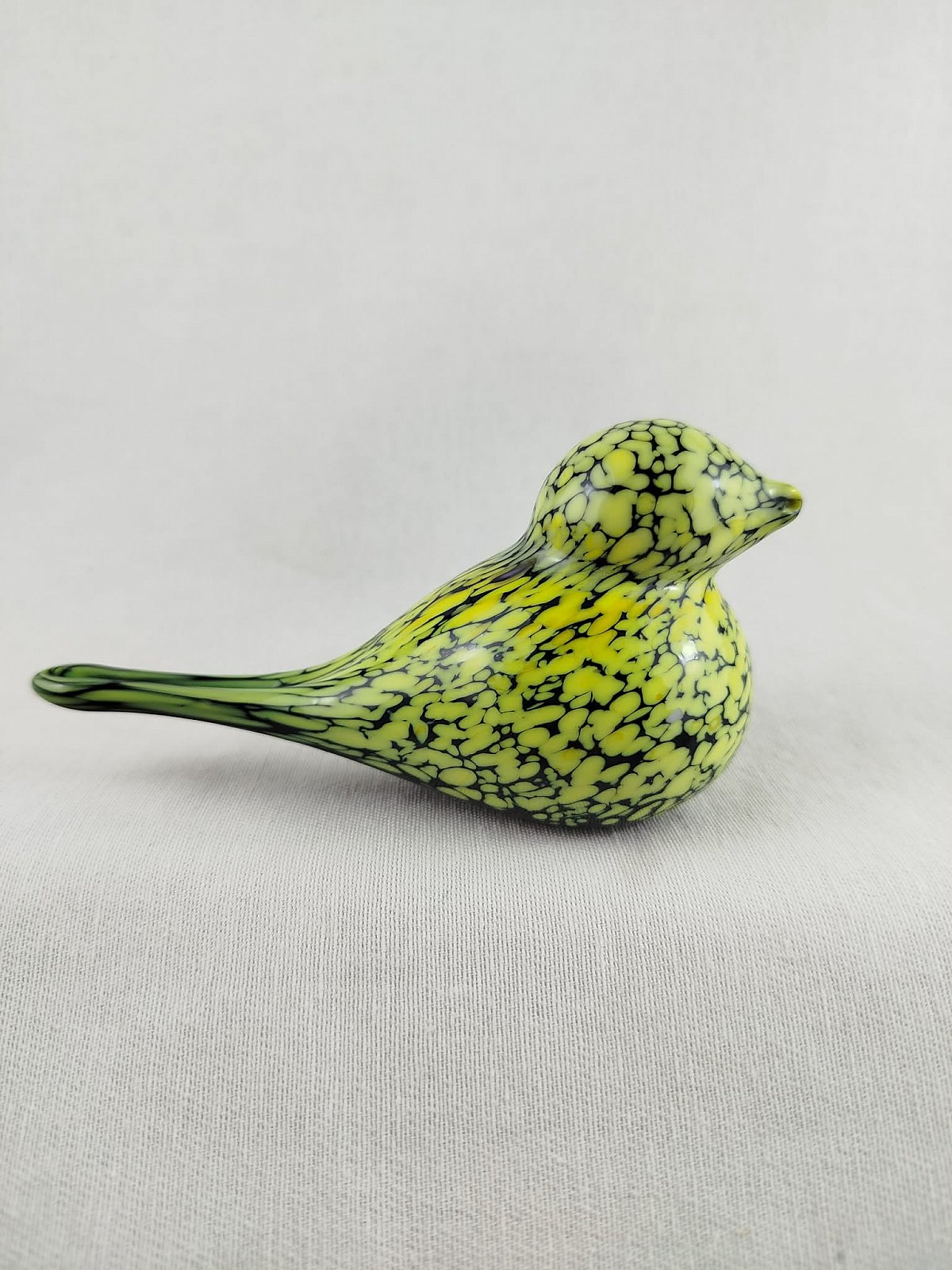Skleněný ptáček, ručně tvarovaný v černé barvě se žlutými bročky