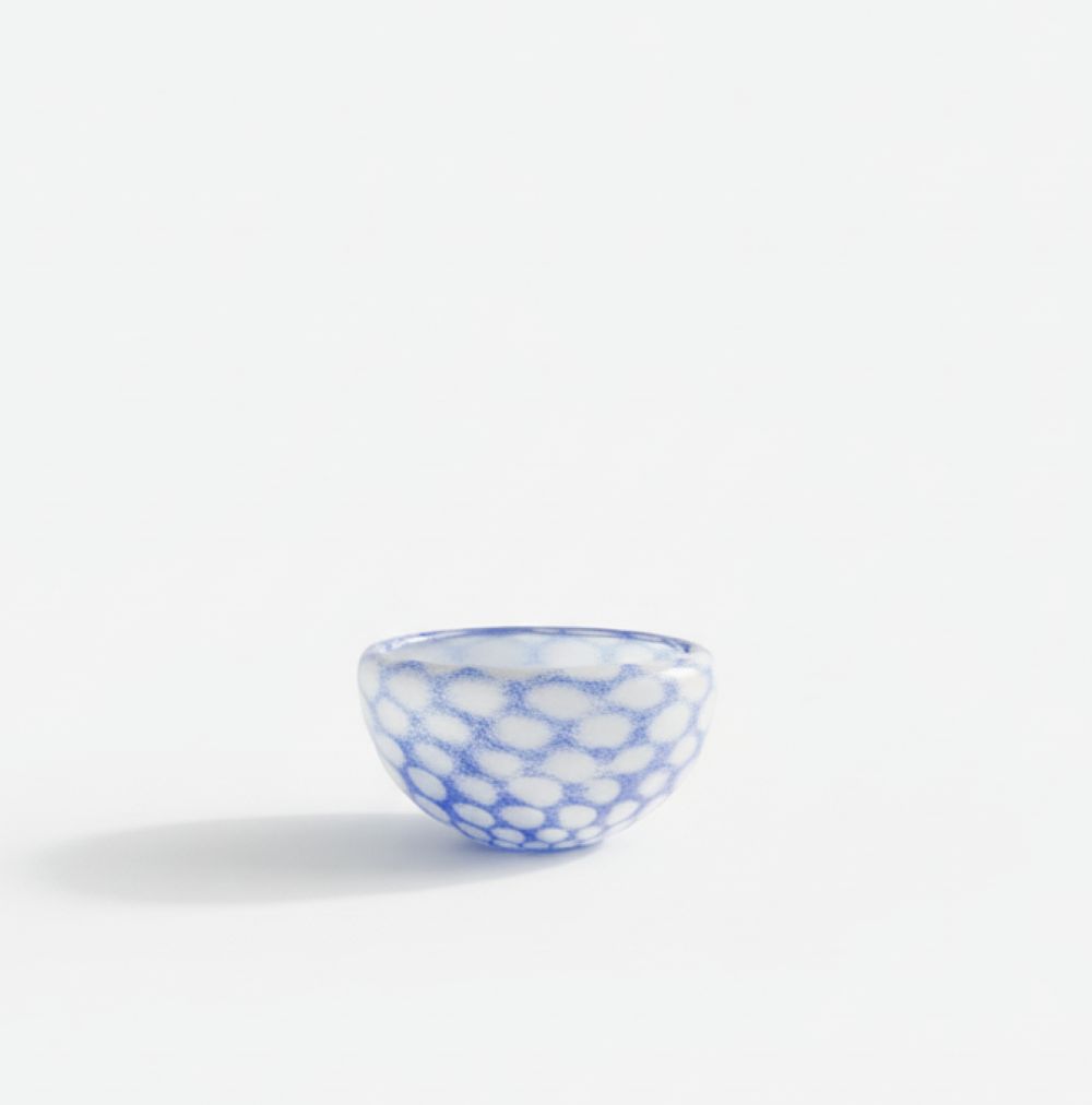 Skleněná, ručně tvarovaná miska v bílo modré barvě.
