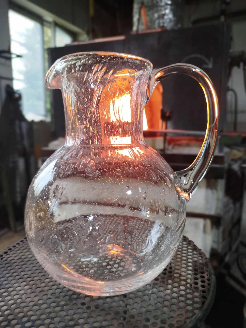 Originální, skleněný džbán z hutního skla s jemným optickým dekorem drobnými bublinkami