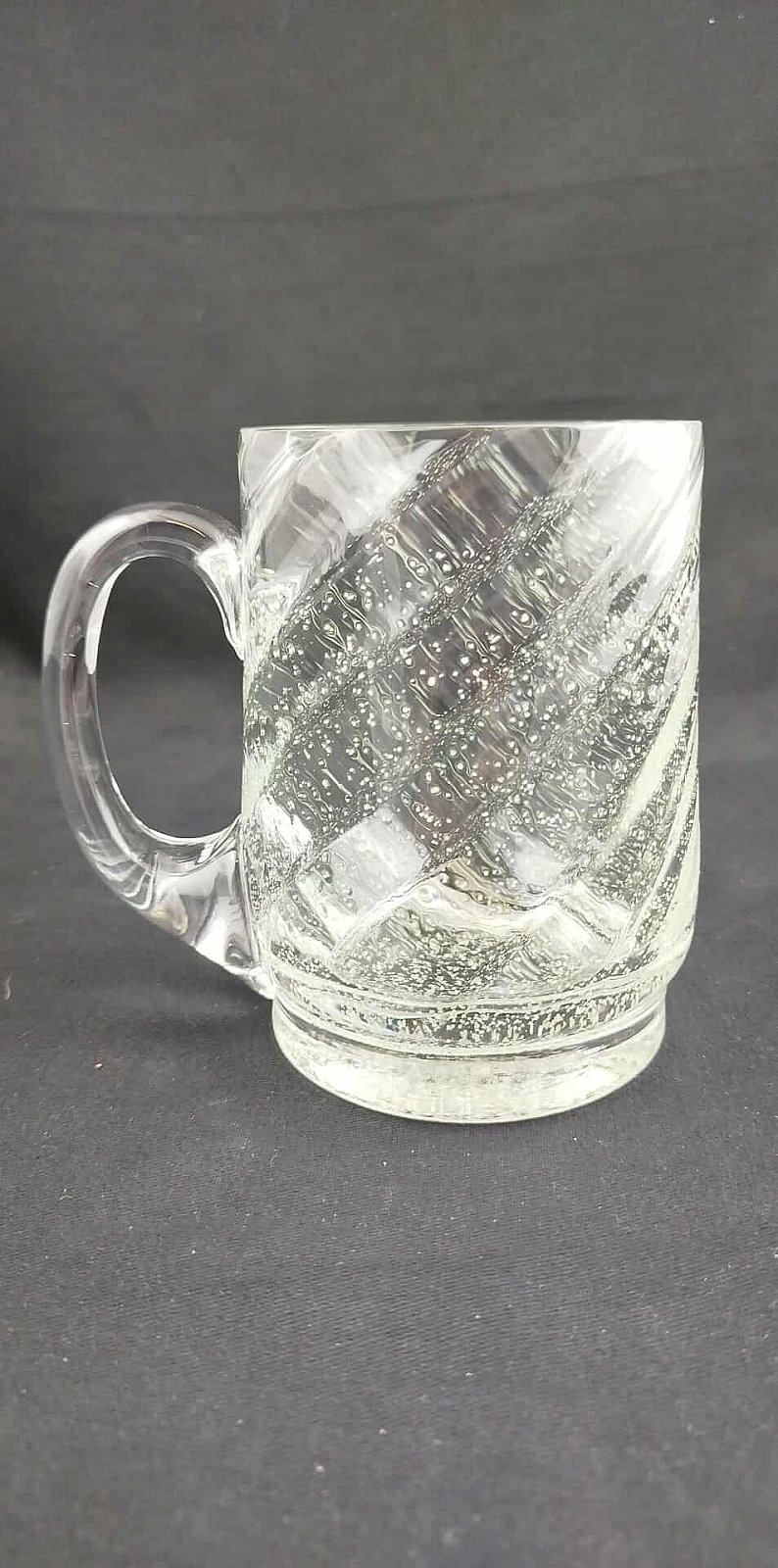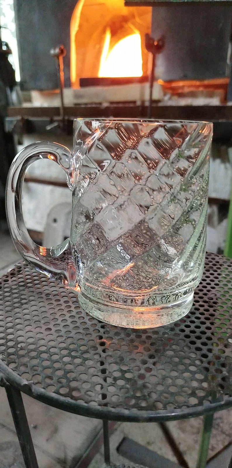 Skleněný půllitr s fotoluminescenčním pigmentem. Na vrchním okraji je méně pigmentu.