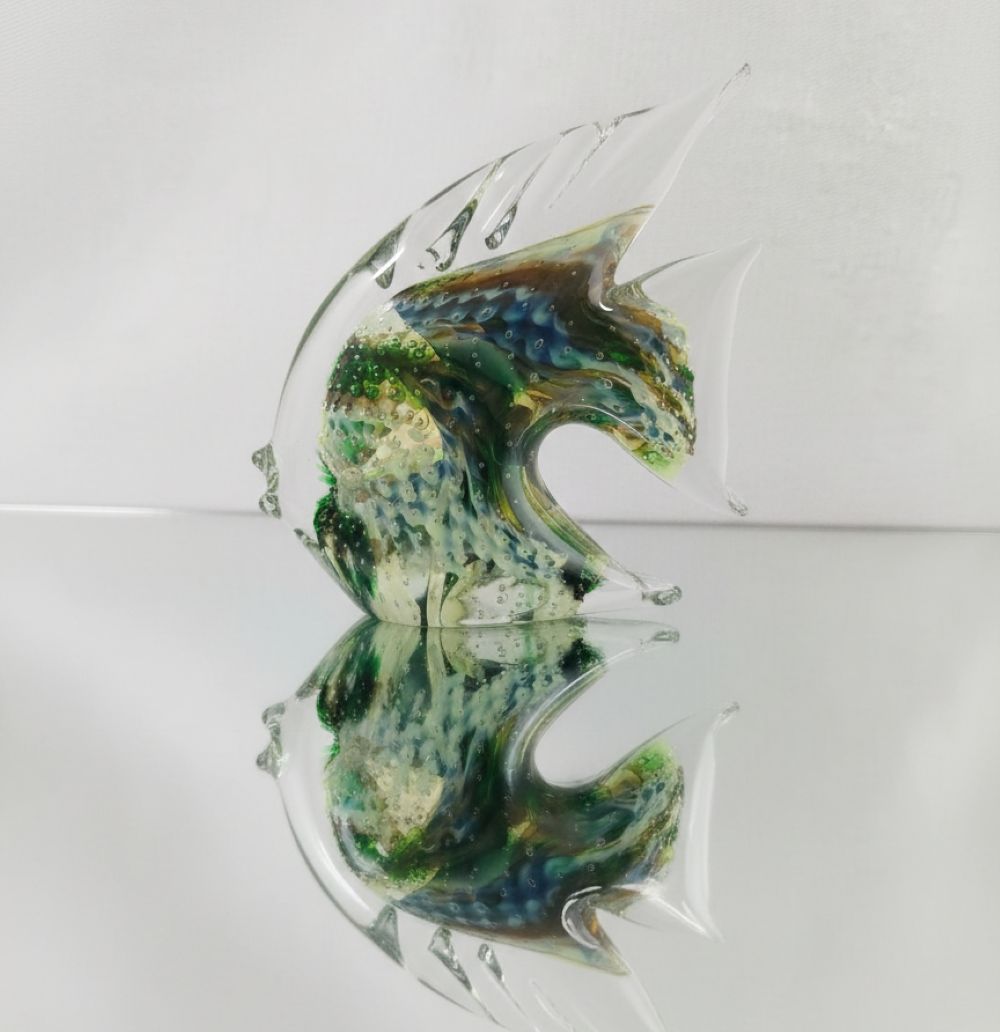 Jemné zeleno-modré tóny uzavřené v čirém skle připomínají pohyb vody a hru světla pod hladinou. Každý detail vznikl pomalu a s citem – tak, aby ryba působila přirozeně, harmonicky a vyváženě.
