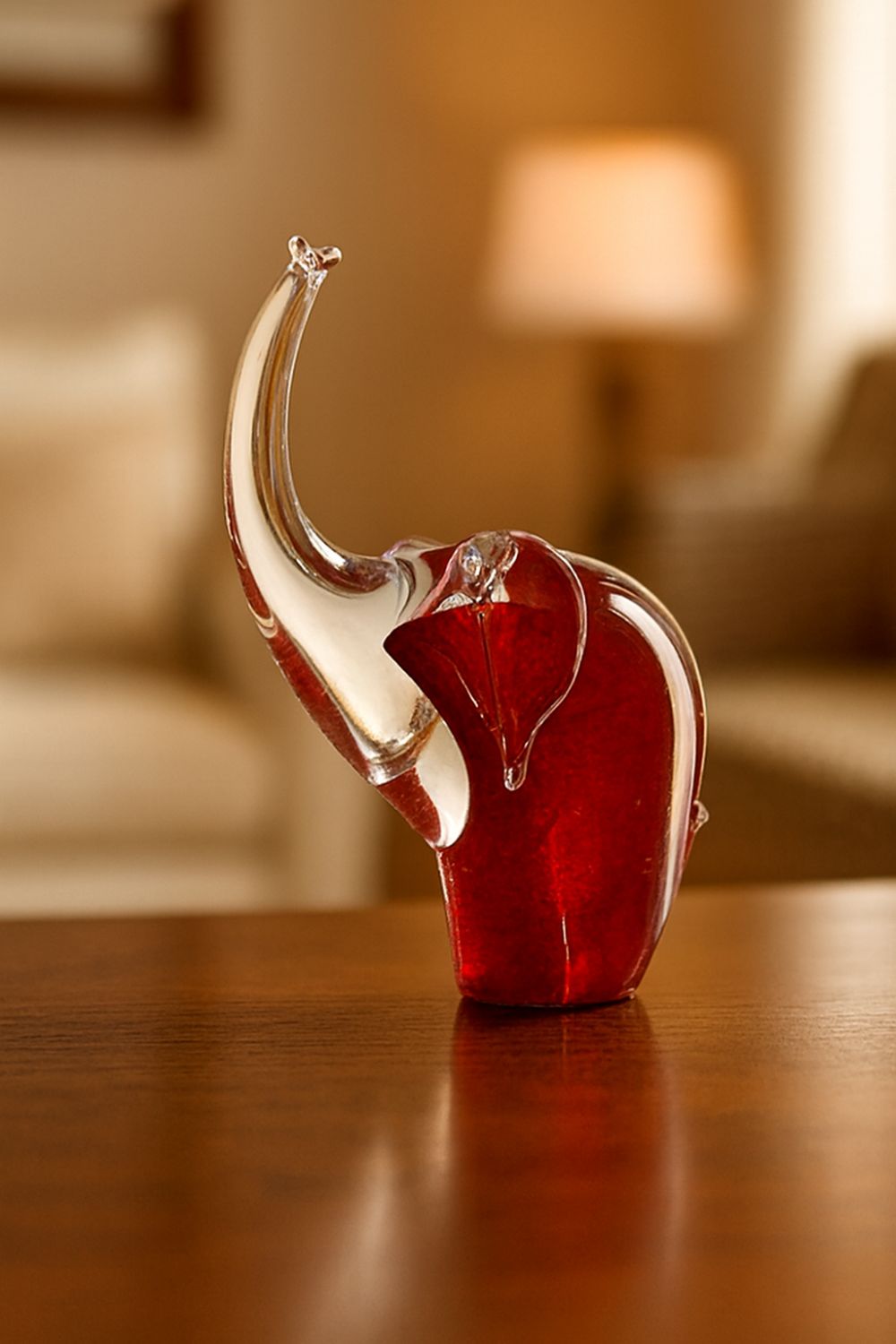 Skleněný slon je křišťálový s křišťálovým chobotem nahoru, křišťálovými oušky a červenou transparentní barvou uvnitř.