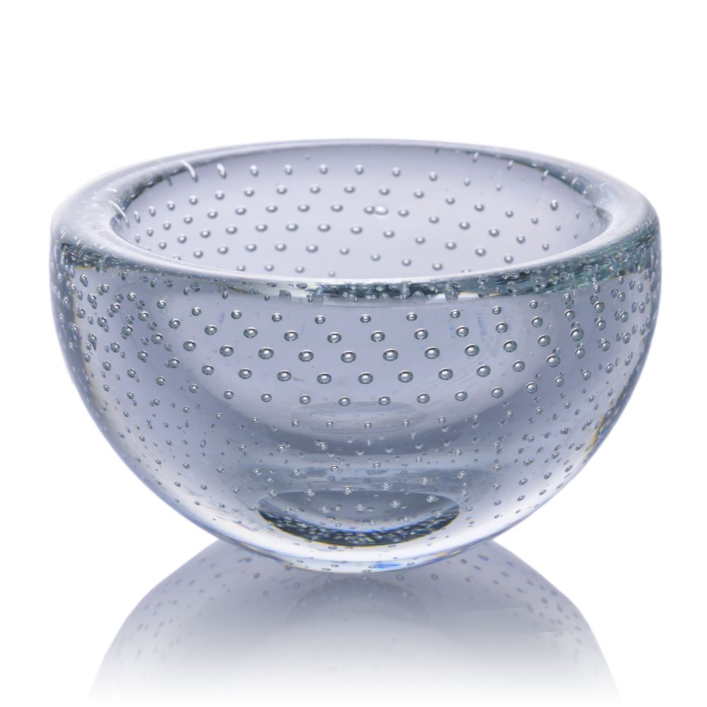 Skleněná, ručně tvarovaná miska z hutního skla s pravidelnými drobnými bublinkami uvnitř.