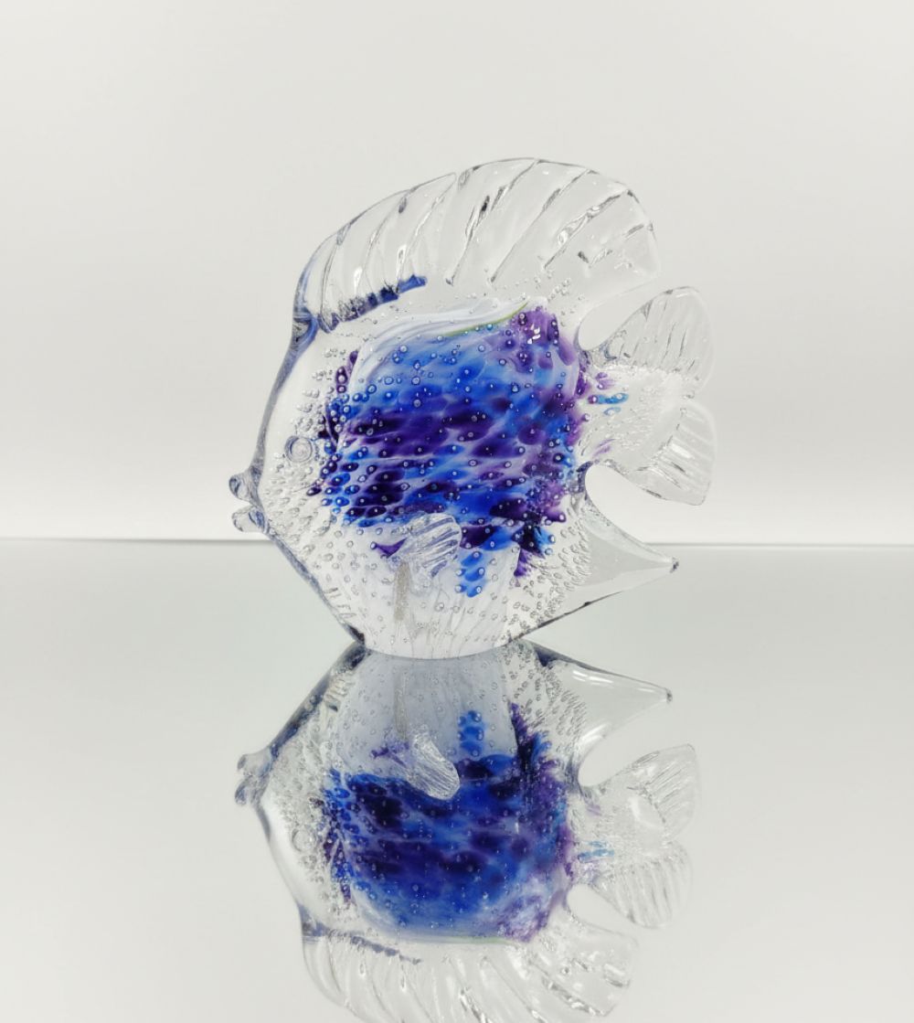 Skleněná, ručně tvarovaná ryba z hutního skla v modré, jemně fialkové a bílé spirálce uvnitř křišťálu s drobnými bublinkami ve skle.