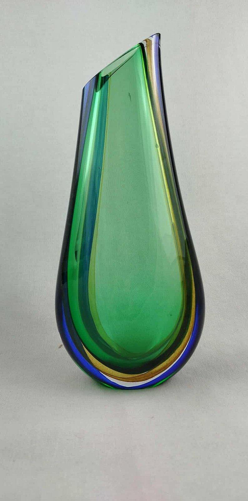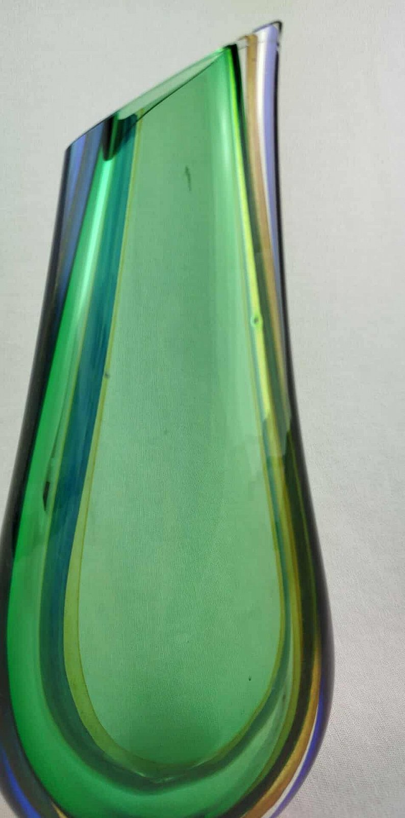 Skleněná váza v barvě zelené, modré a křišťál s broušeným hrdelm. Doprodej