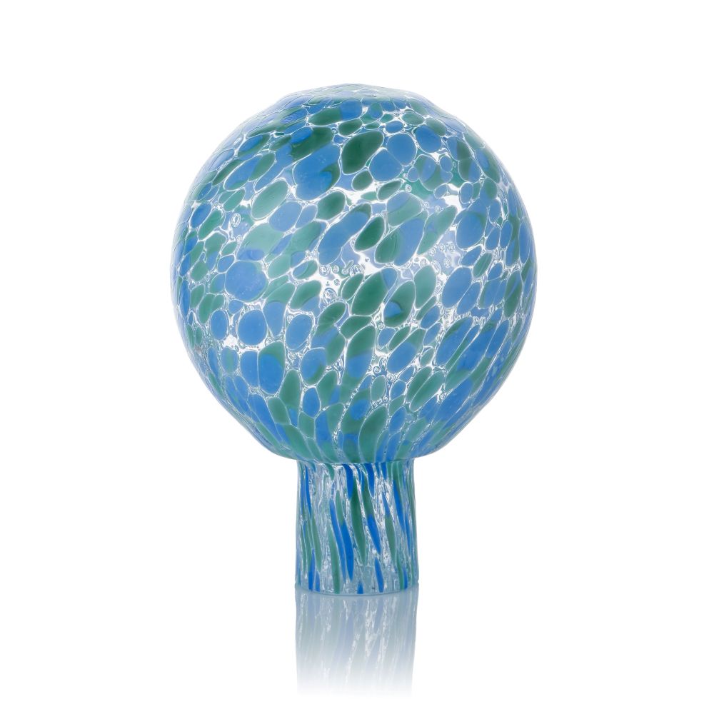 Skleněná koule na plot (Plotová koule) v modrozelené barvě sypané sodou, která ve skle dělá nepravidelné bublinky