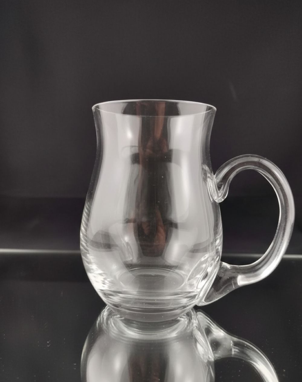 Skleněný, ručně tvarovaný půllitr na pivo z hutního skla s broušeným hrdlem ve tvaru džbánku.