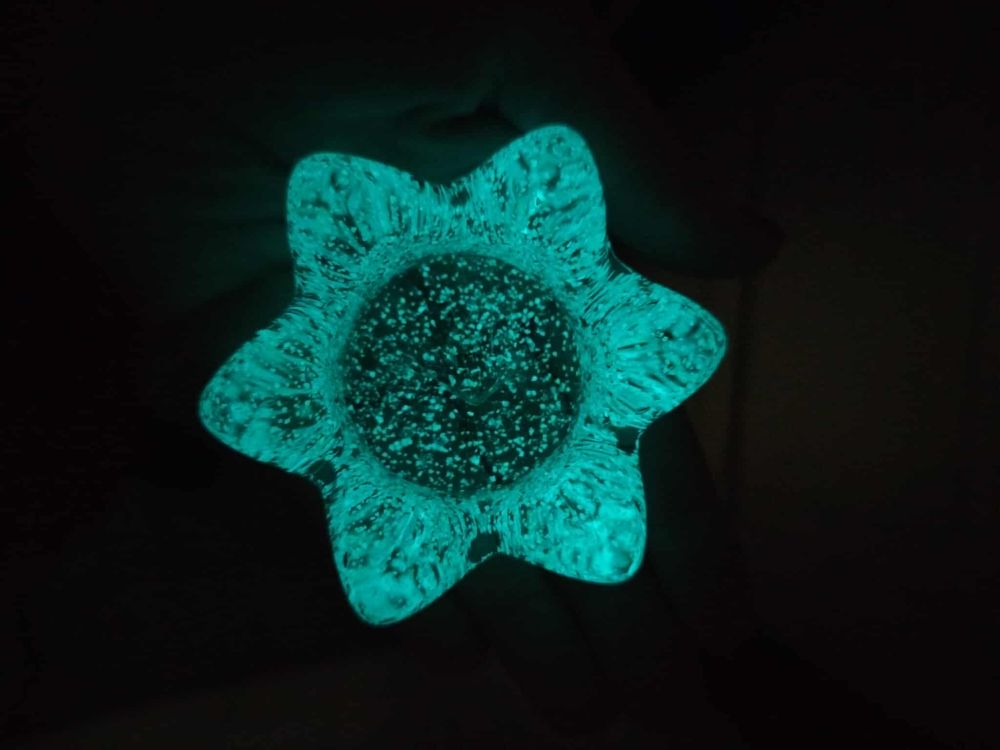 Skleněný svícen na čajovou svíčku obsahuje speciální fotoluminescenční pigment, který reaguje na světlo a tak vydává podmanivý světelný efekt.
