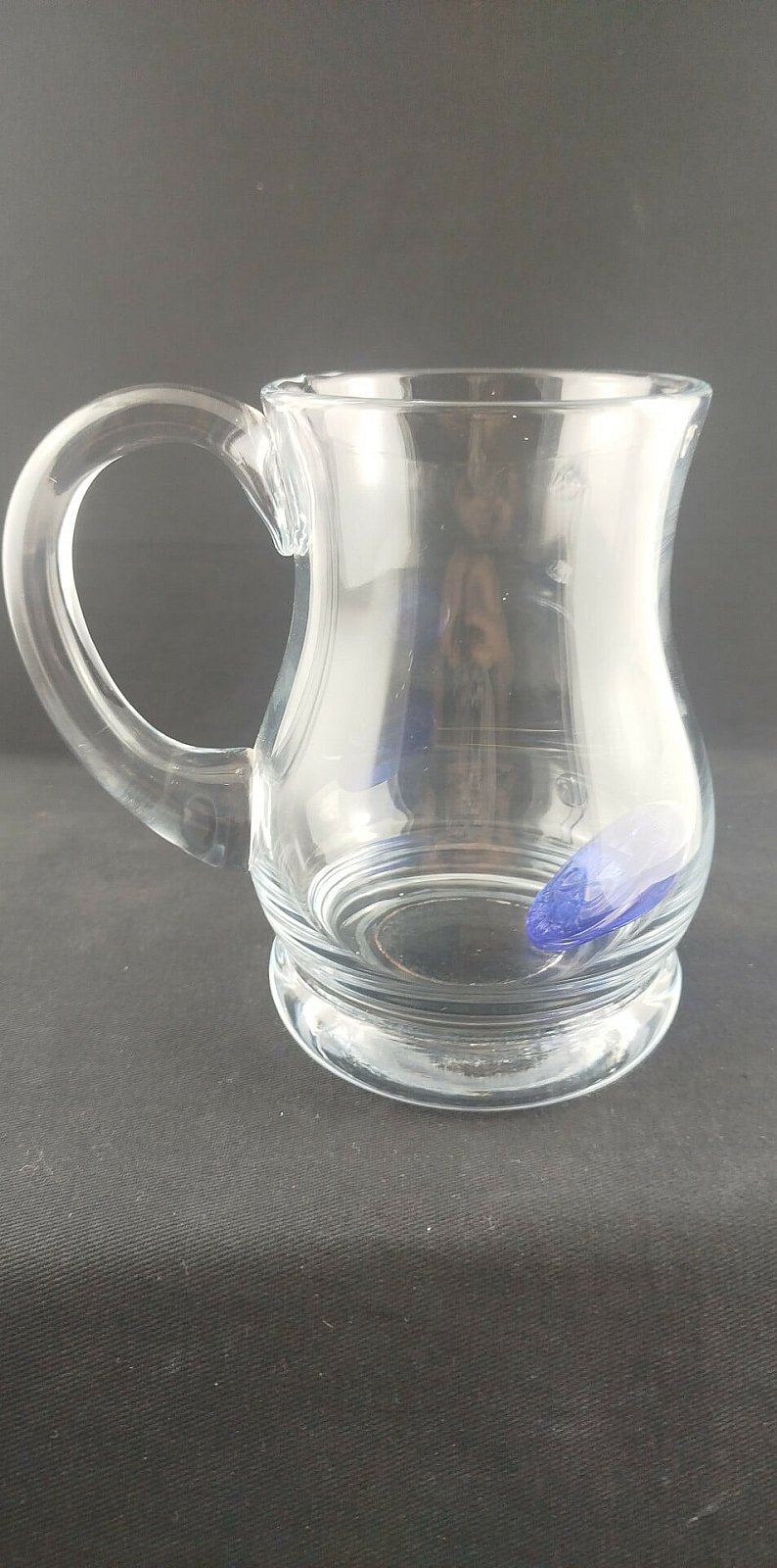Skleněná půllitr s modrou pečetí uvnitř. Na pečeti je znak a text vysočina sklářská.