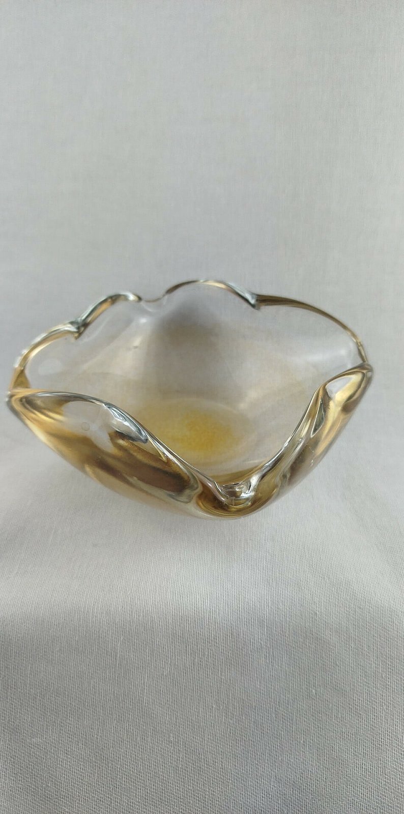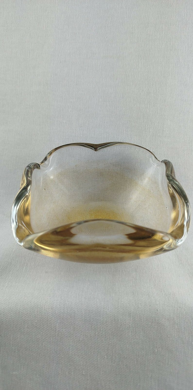 Skleněný popelník v lehce topasové barvě z hutního skla. Doprodej.