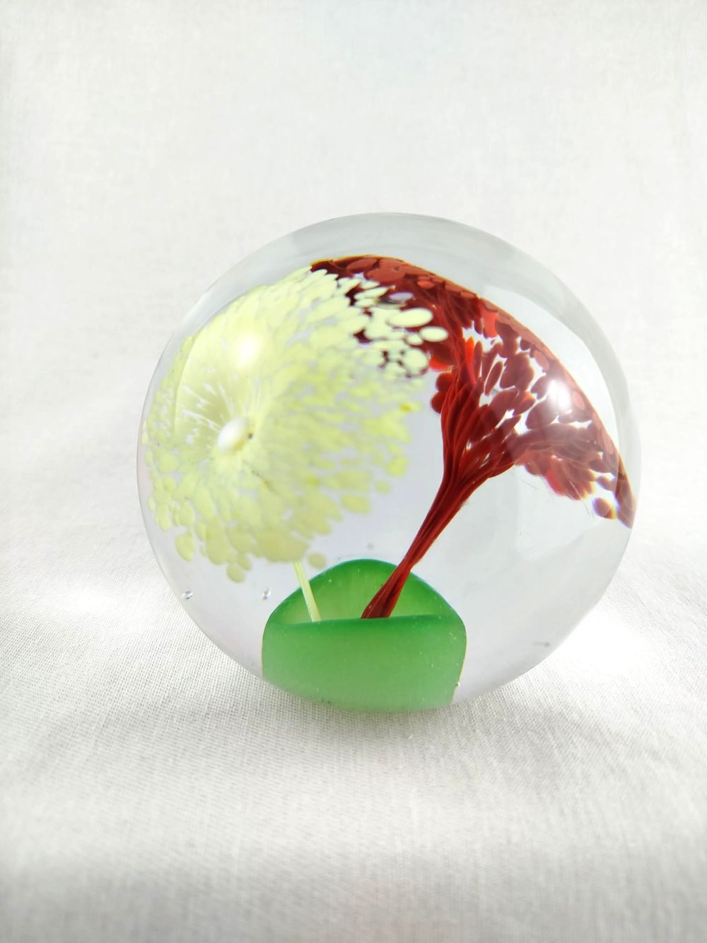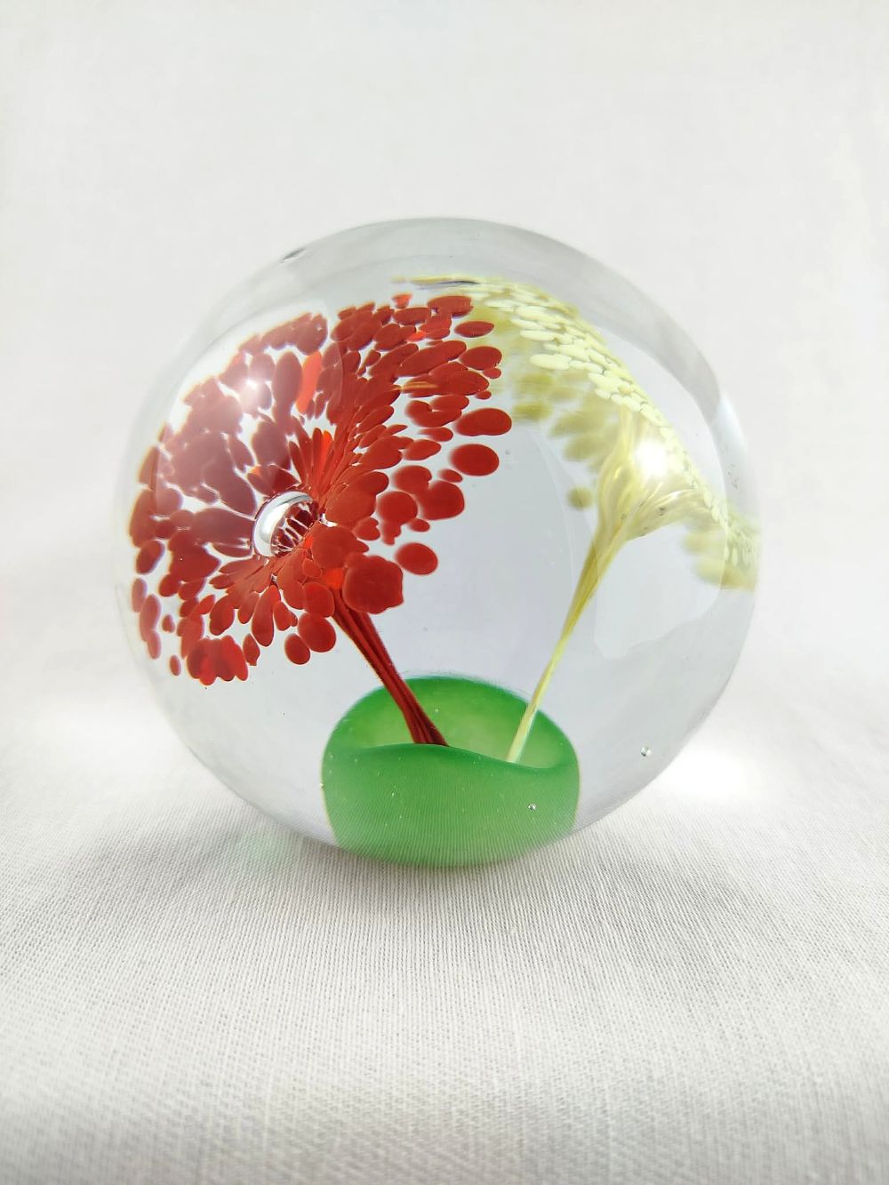 Toto ručně vyráběné skleněné těžítko ukrývá dvě květinové duše — sytě červenou a žlutou gerberu — zakotvené v zářivě zeleném podstavci, jako by vyrůstaly ze samého srdce jara.