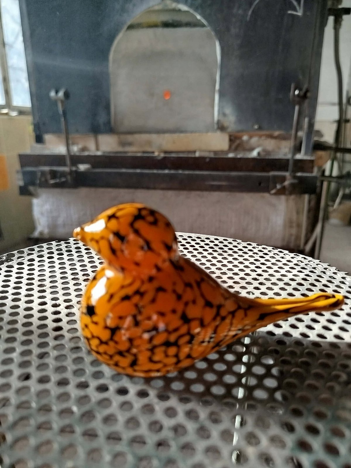 Skleněný ptáček, ručně tvarovaný v černé barvě s oranžovými bročky