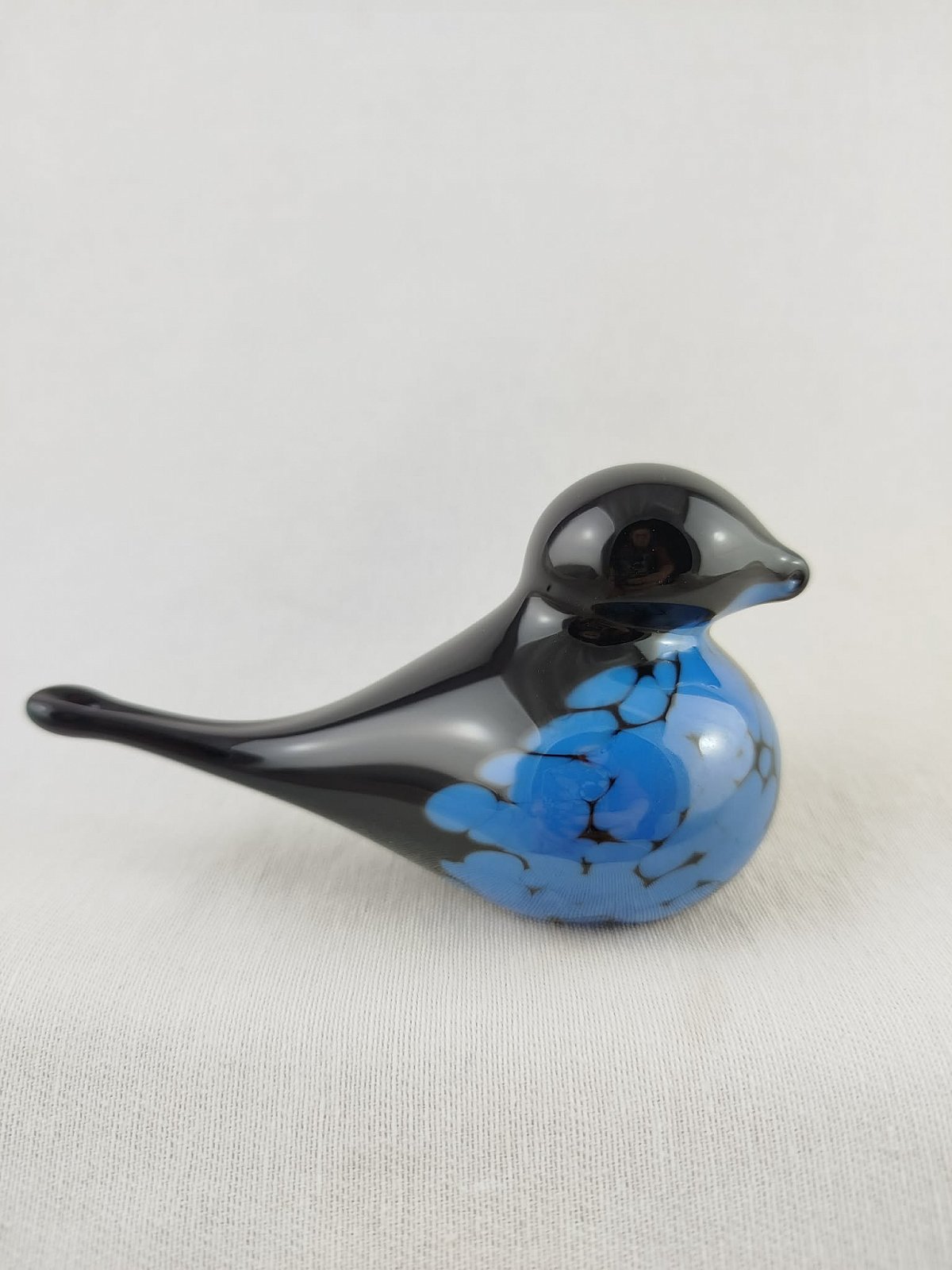Skleněný ptáček, ručně tvarovaný v černé barvě s modrými bročky
