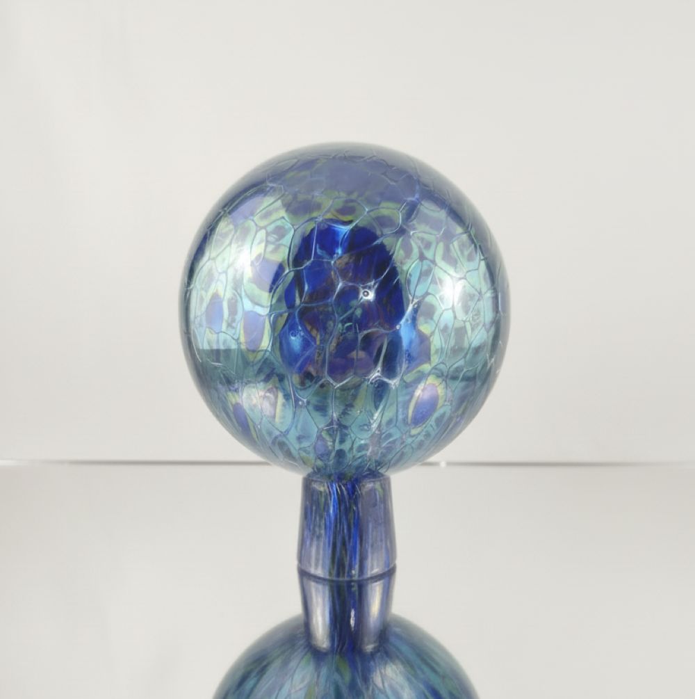 Ručně vyráběná skleněná plotová koule v modré iris barvě.
