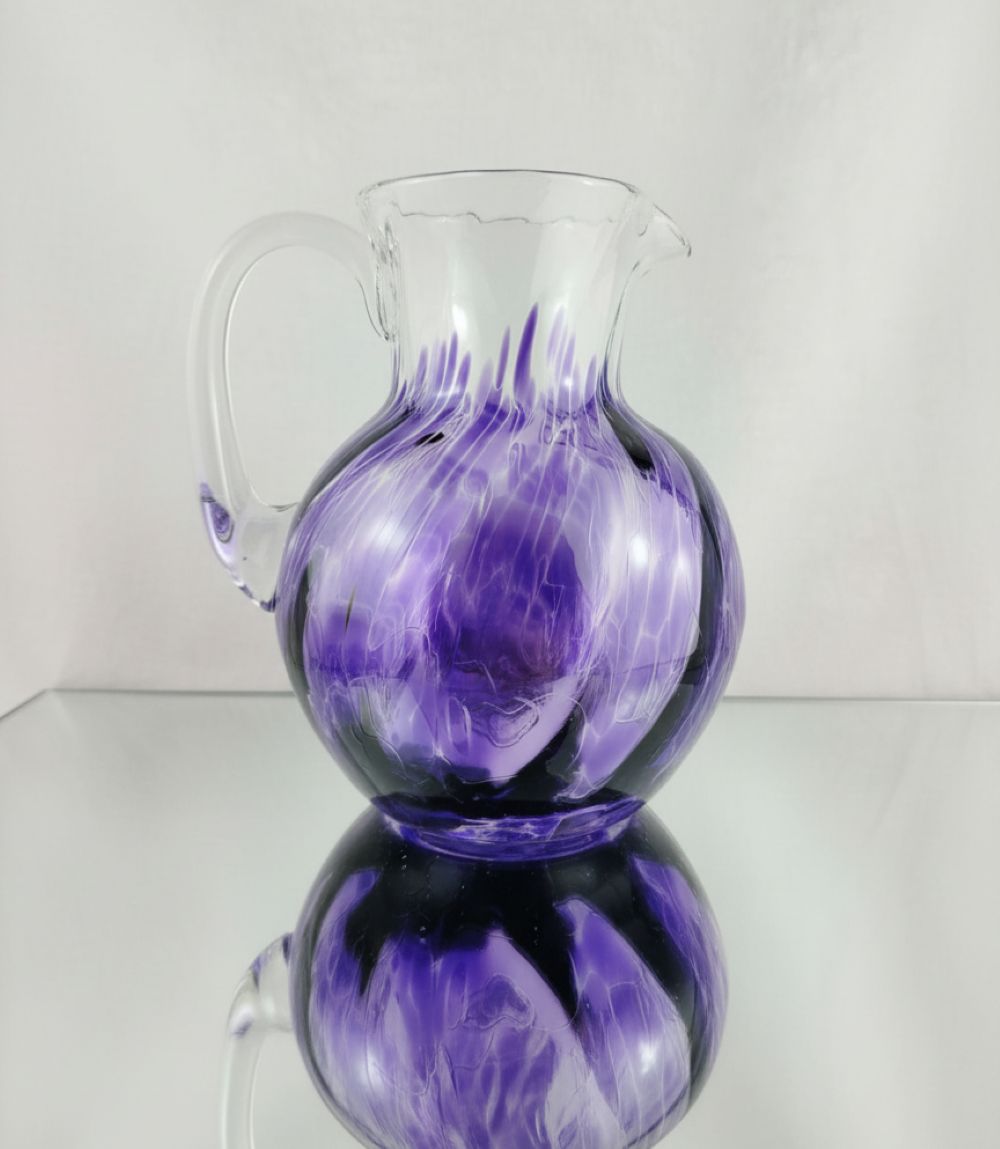 Originální, skleněný džbán z hutního skla s optickým dekorem v barvě fialkové.
