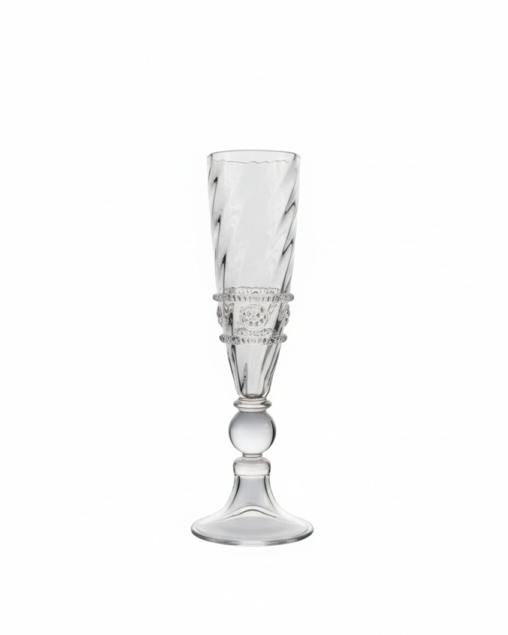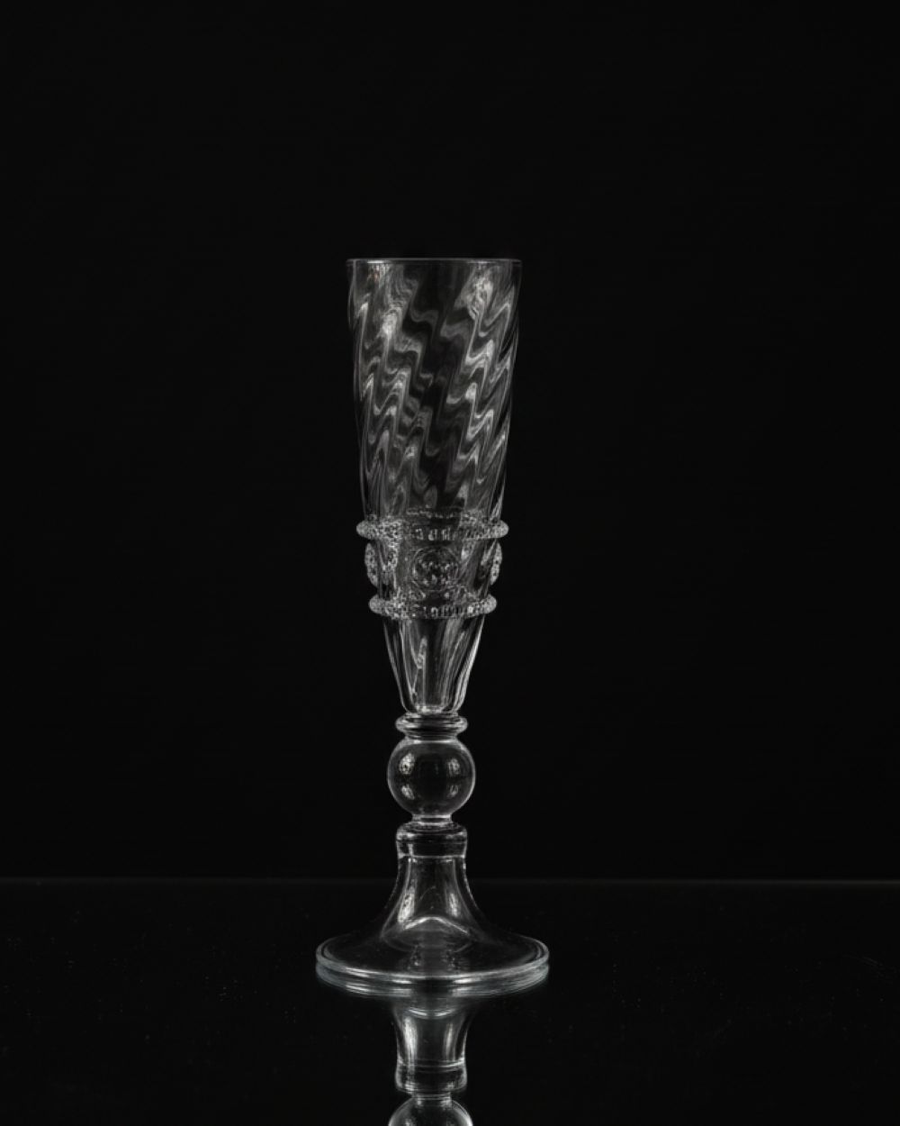 Tato výjimečná skleněná číše v čirém křišťálovém provedení navazuje na tradici historického užitkového skla. Elegantní silueta s výraznou nohou je doplněna ručně tvarovanými nálepy, které podtrhují řemeslný charakter a dodávají číši osobitý výraz.