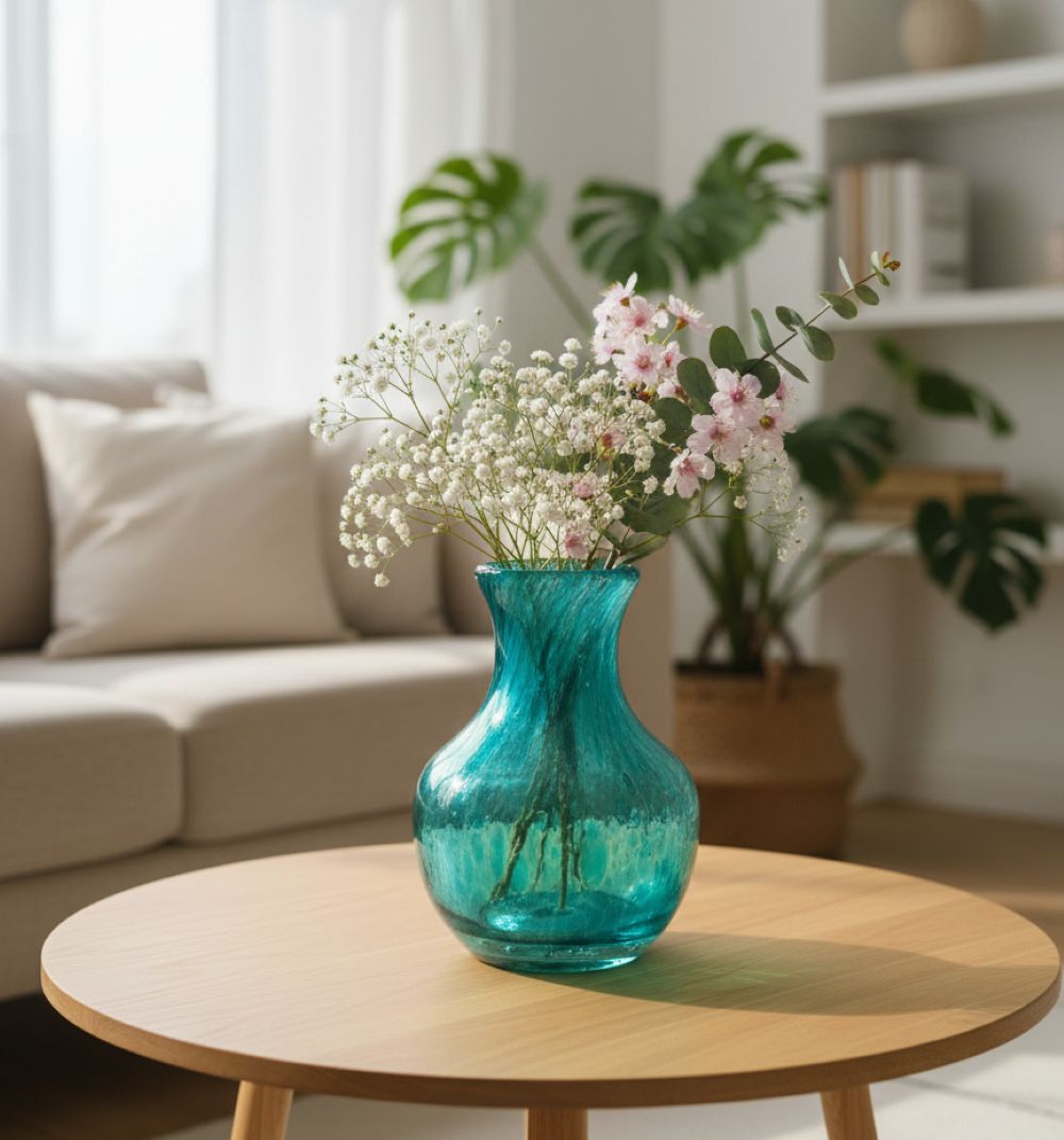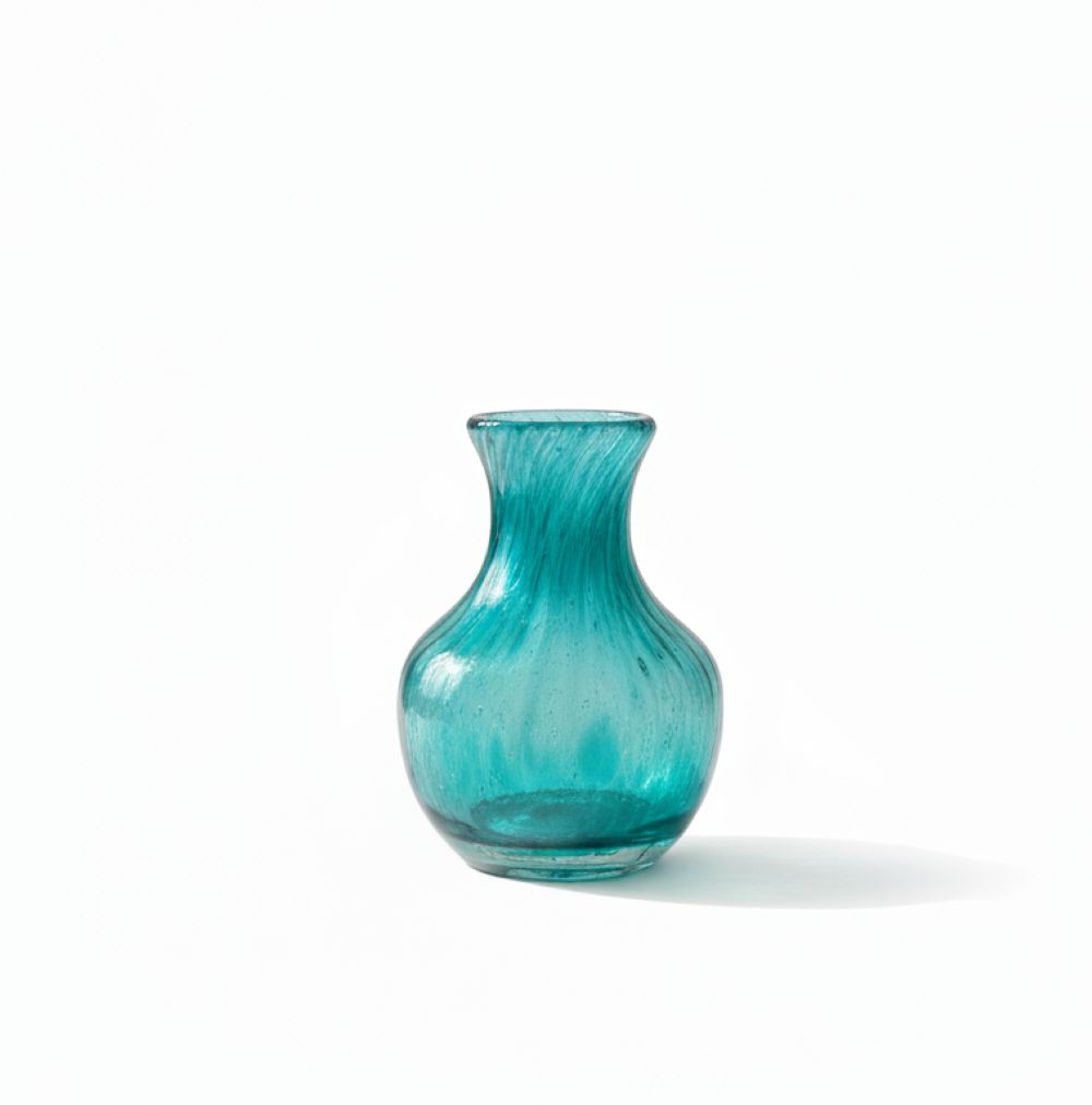 Každý kus vzniká ručně u sklářské pícky, a proto je originál – jemné rozdíly v tvaru, tloušťce skla či odstínu tyrkysu jsou přirozenou součástí řemeslné práce a dodávají vázičce její jedinečný charakter.