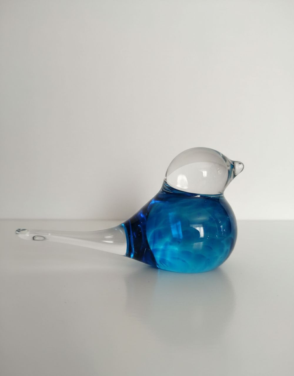 Skleněné, ručně tvarované těžítko ve tvaru ptáčka v tyrkysové barvě.