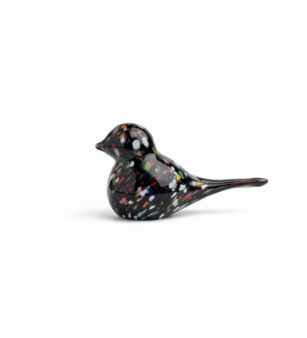 Skleněný ptáček, ručně tvarovaný v černé barvě sbročky v barvě multicolor.
