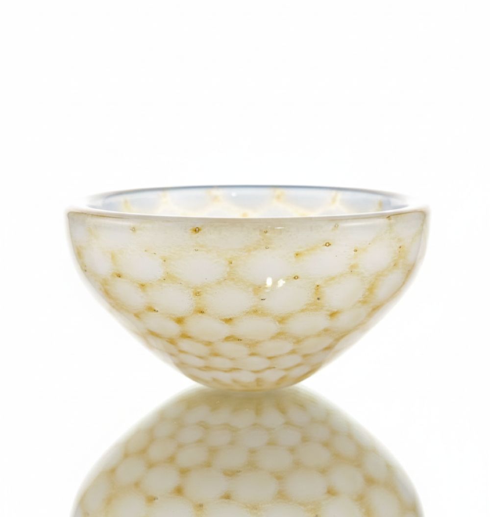 Skleněná, ručně tvarovaná miska s ozdobným vzorem v bílotopasové barvě.