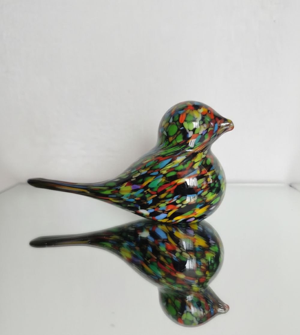 Skleněný ptáček, ručně tvarovaný v černé barvě s bročky v barvě multicolor menší.