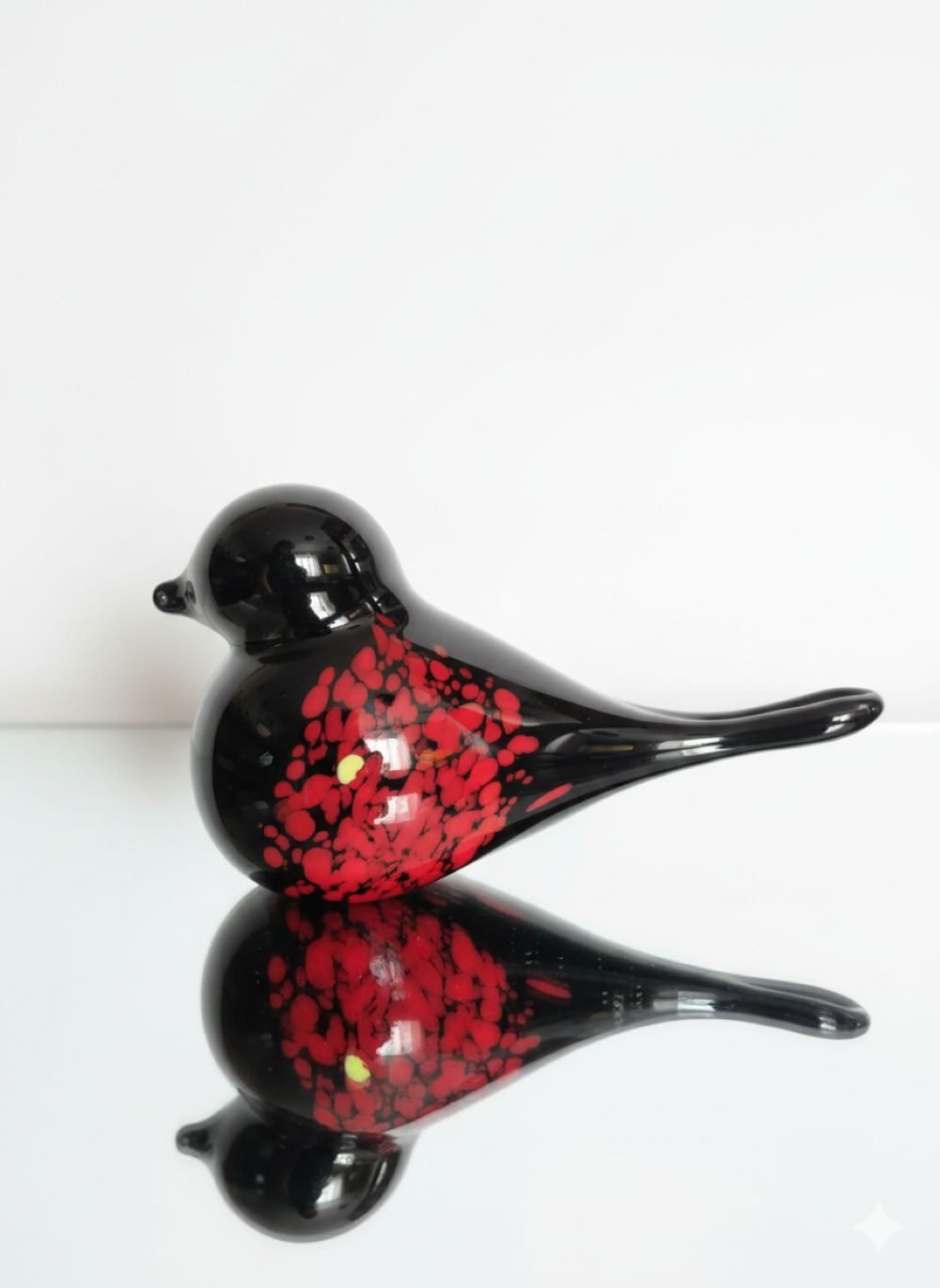 Skleněný ptáček, ručně tvarovaný v černé barvě s bročky v barvě červené.