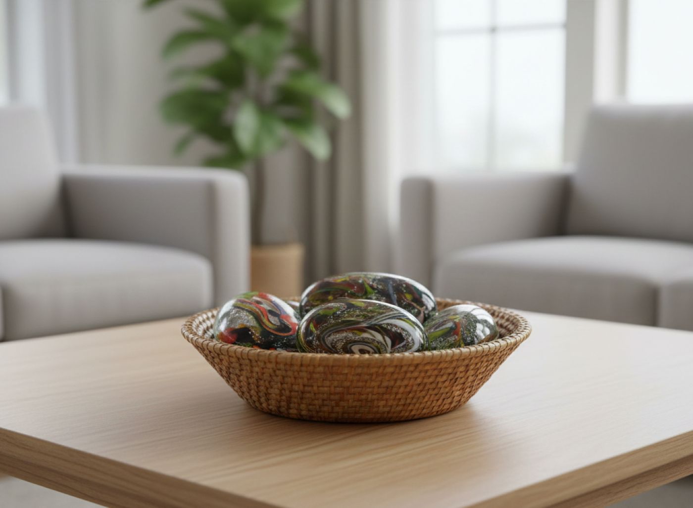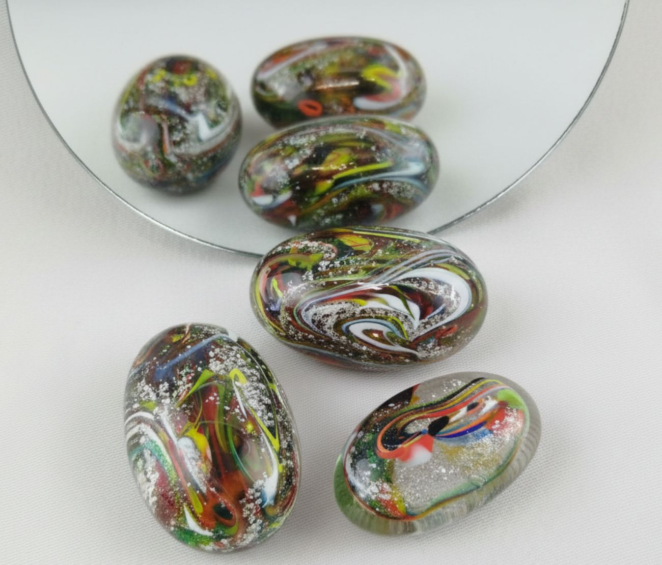 Každý z těchto kamínků je jako kapka barevné fantazie – žádné dva nejsou stejné. Uvnitř se třpytí slída, která se na světle jemně leskne a dává sklu hloubku, jako by v něm byl ukrytý celý vesmír.