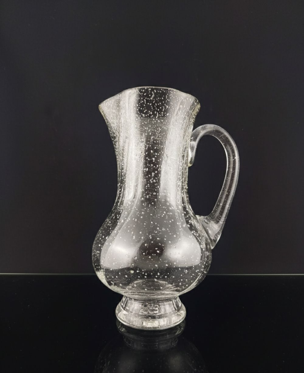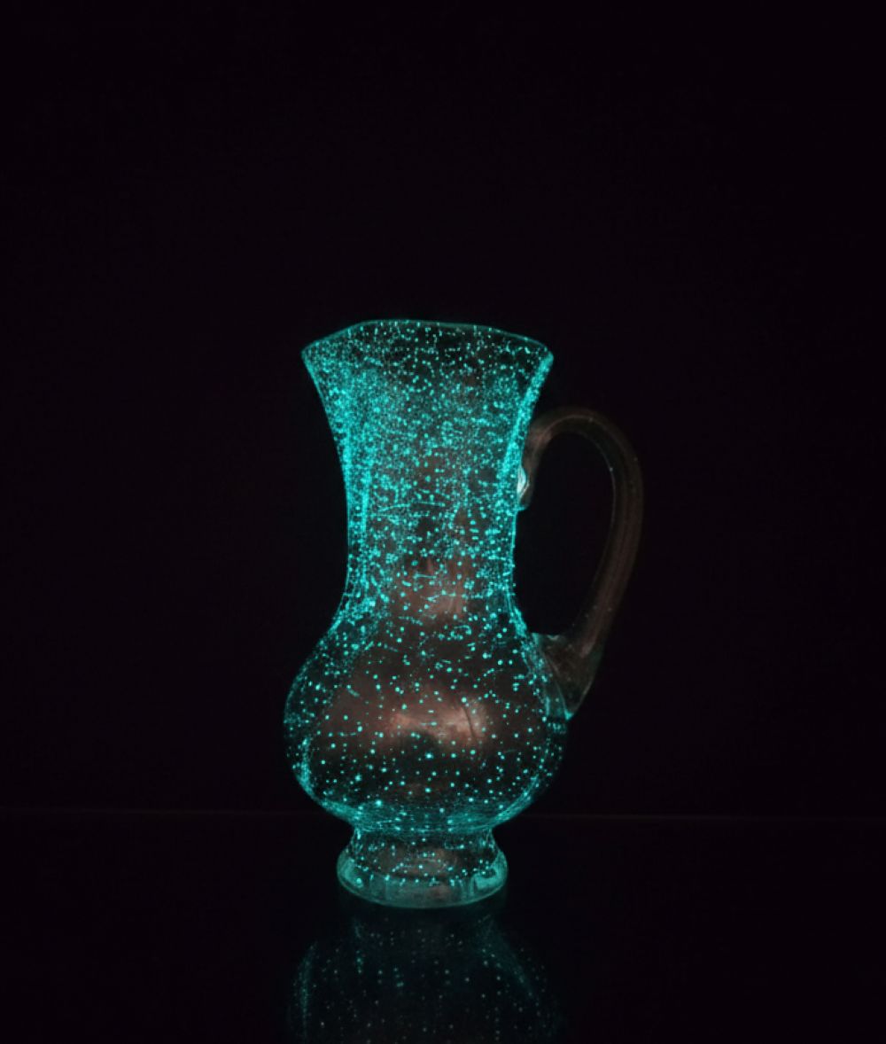 Ručně vyráběný skleněný džbán, který po nasvícení svítí modře s jemným optickým vzorem.