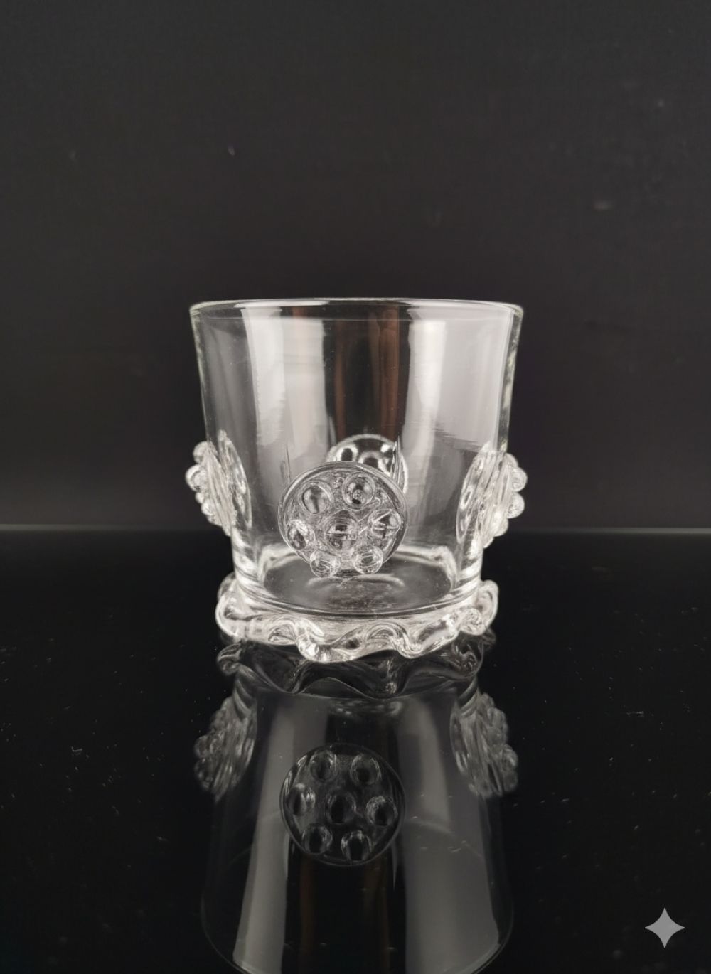 Sklenička z křišťálového skla má šestihranný tvar, který vychází z tradičních forem historického užitkového skla. Je zdobena plastickými nálepy zvanými maliny.