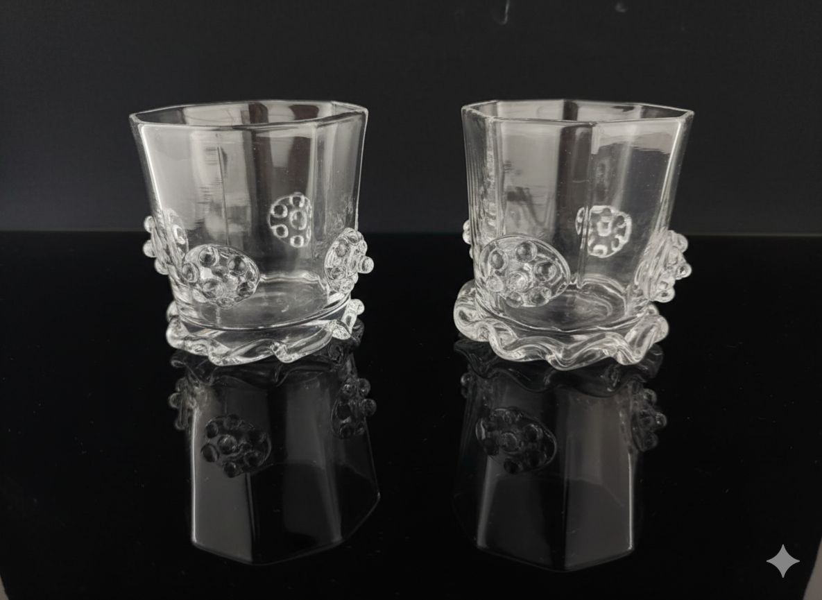 Sklenička z křišťálového skla má osmihanný tvar, který vychází z tradičních forem historického užitkového skla. Je zdobena plastickými nálepy zvanými maliny.