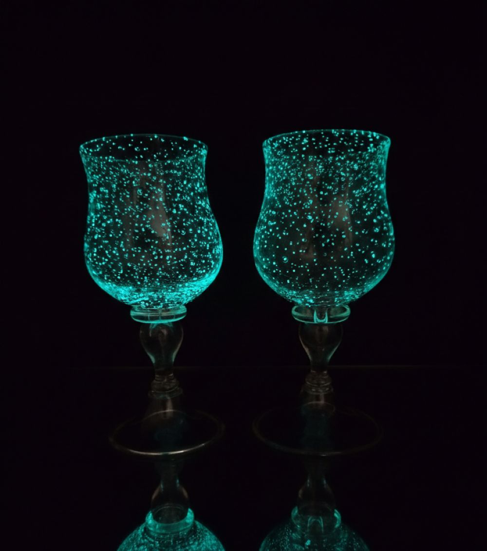 Sklenice na víno se zapalovaným hrdlem, která ve tmě svítí modře.