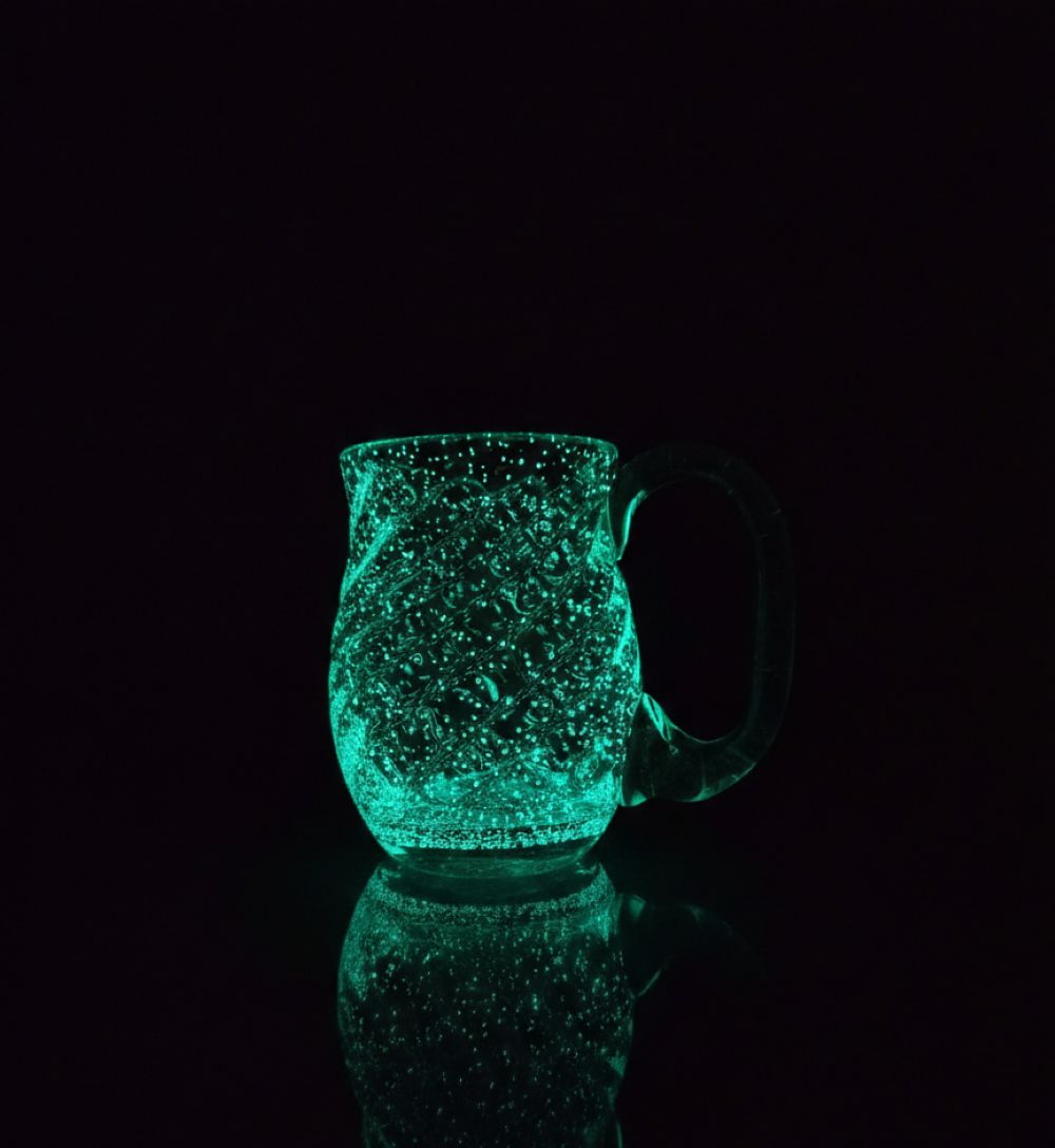 Tahle ručně vyrobená skleněná třetinka o objemu 300 ml ukrývá v sobě jemné modré tečky, které jsou ve skle. Přes den decentní detail, ve tmě se promění v příjemně modře zářící podívanou, která rozzáří každý stůl i náladu.